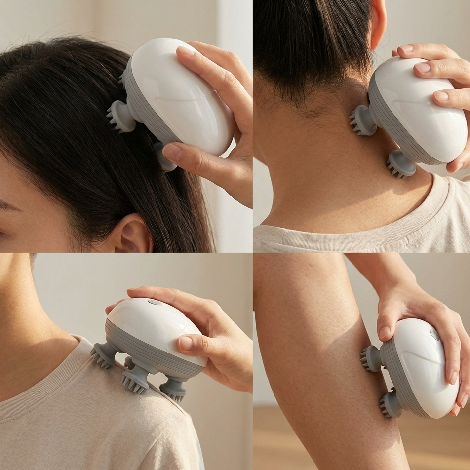 Multi-purpose Use: Sirf scalp hi nahi, ise aap neck, shoulders aur legs par bhi massage ke liye use kar sakte hain, jaisa ki alag-alag tasveeron mein dikhaya gaya hai.